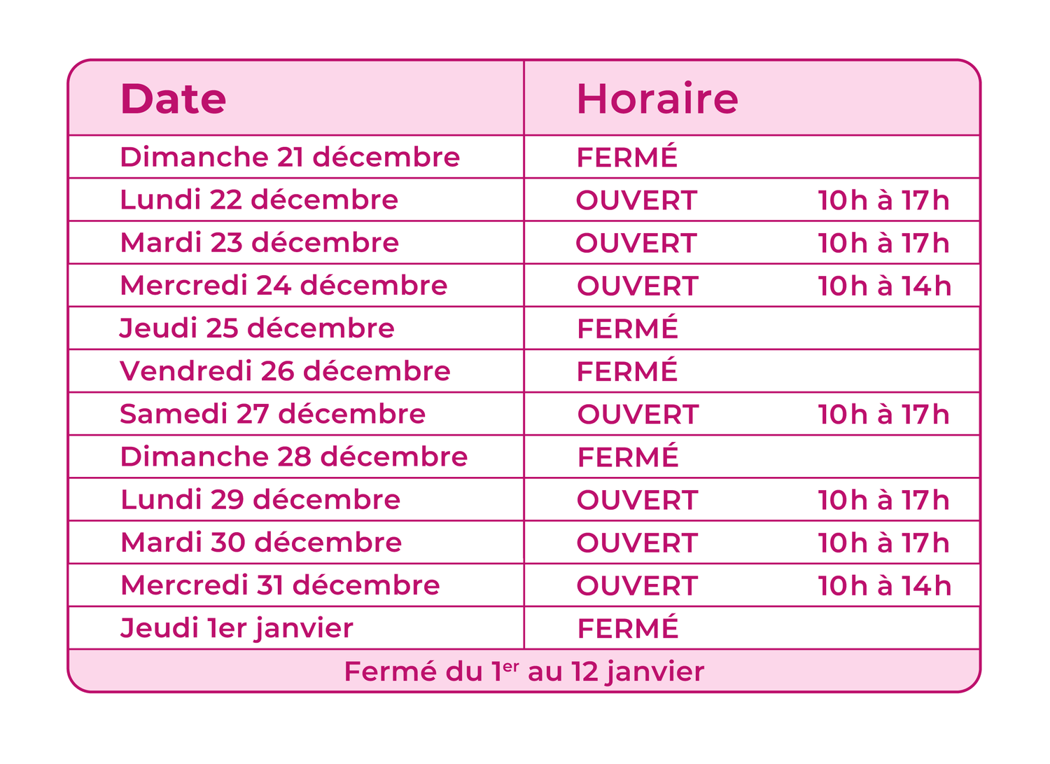 Un doute sur une journée en particulier ? Consultez notre page Google, nos horaires y sont toujours à jour !